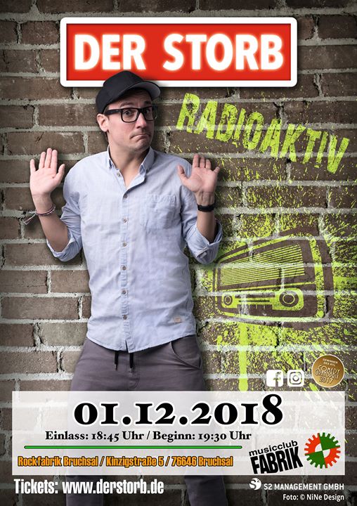 Ob Winetastings, Freunde mit Weber Grill oder Windeln für Erwachsene – Der Storb nimmt kein Blatt vor den Mund, was insbesondere als Radiomoderator eine gute Idee ist. Schnell, laut, ungezähmt – Der Storb ist ein Muss für Augen und Ohren. Am 01. Dezember 2018 mit seinem Live-Programm „Radioaktiv“ im Musicclub Fabrik Bruchsal.